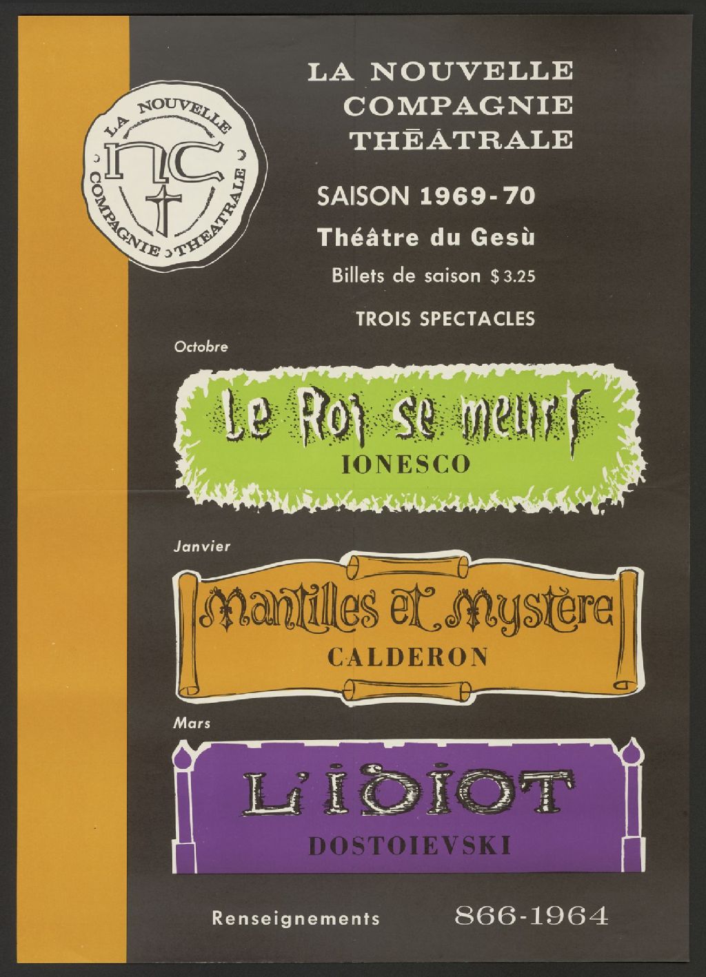 La Nouvelle compagnie théâtrale, saison 1969-70... 3 spectacles... Le roi se meurt... Mantilles et mystères... L'idiot...