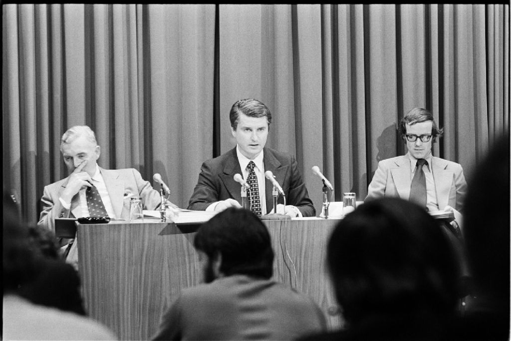 Conférence de presse du ministre Rodrigue Tremblay à l'Édifice B, 1977-01-12, Archives nationales à Québec, Fonds Ministère des Communications, (03Q,E10,S44,SS1,D77-69), Raymond Duguay.