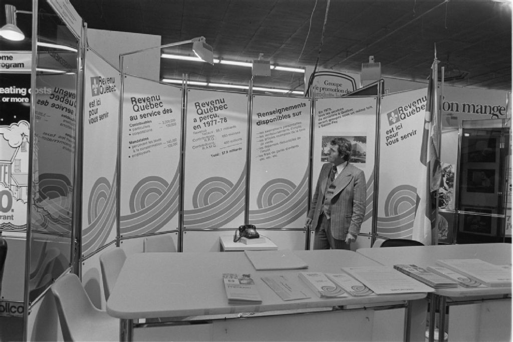 Kiosques des ministères du Revenu, de l'Industrie et du commerce et de la Justice, de la Régie de l'assurance automobile et de l'office de la langue française lors d'Expo-Québec
