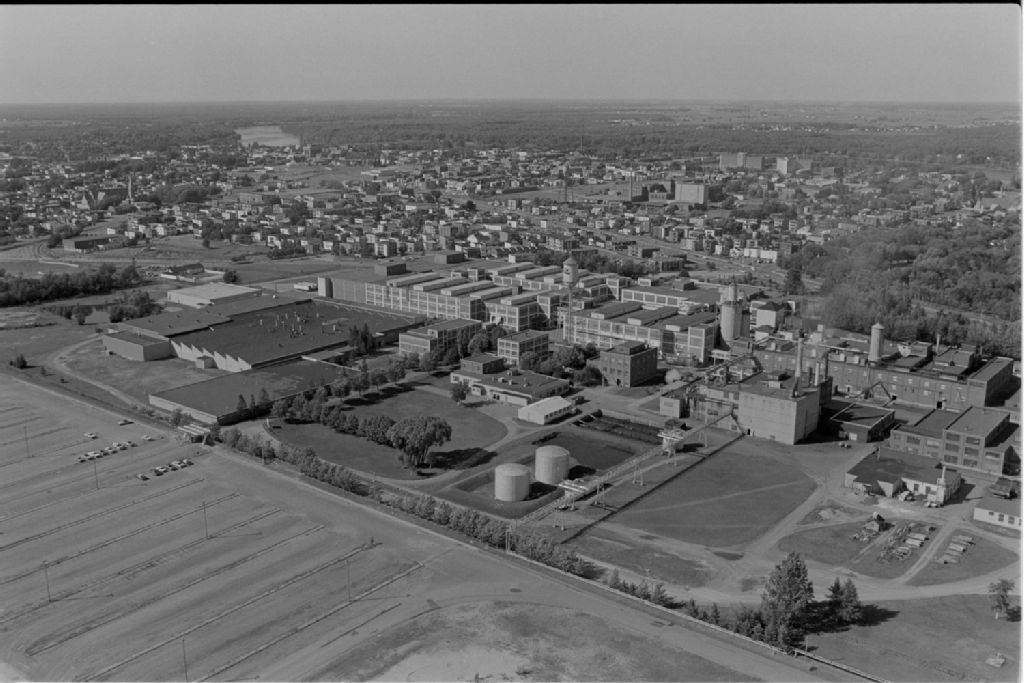 Vues aériennes des usines Celanese et Tex-Made, des échangeurs de la route 20 et de la ville de Drummondville et de Trois-Rivières, 1978-08, Archives nationales à Québec, Fonds Ministère des Communications, (03Q,E10,S44,SS1,D78-714), Daniel Lessard.