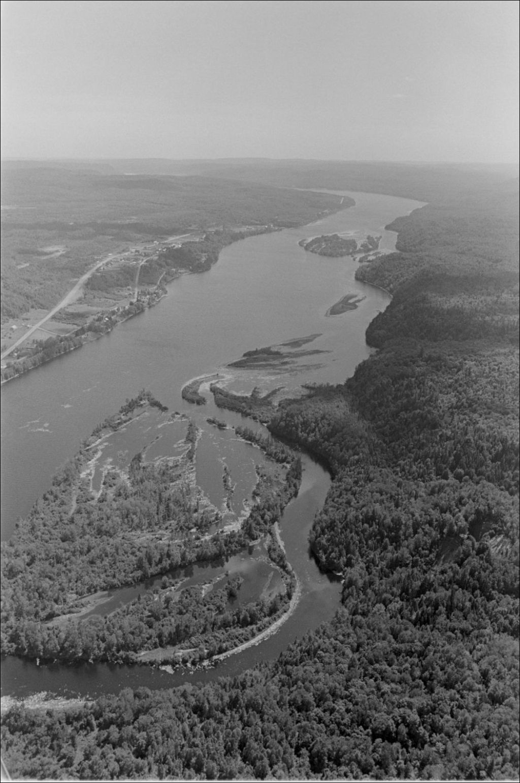 - Vues aériennes de la rivière Saint-Maurice et de la ville, de l'usine de la Canadian International Paper, du camping municipal et du barrage d'Hydro-Québec à La Tuque