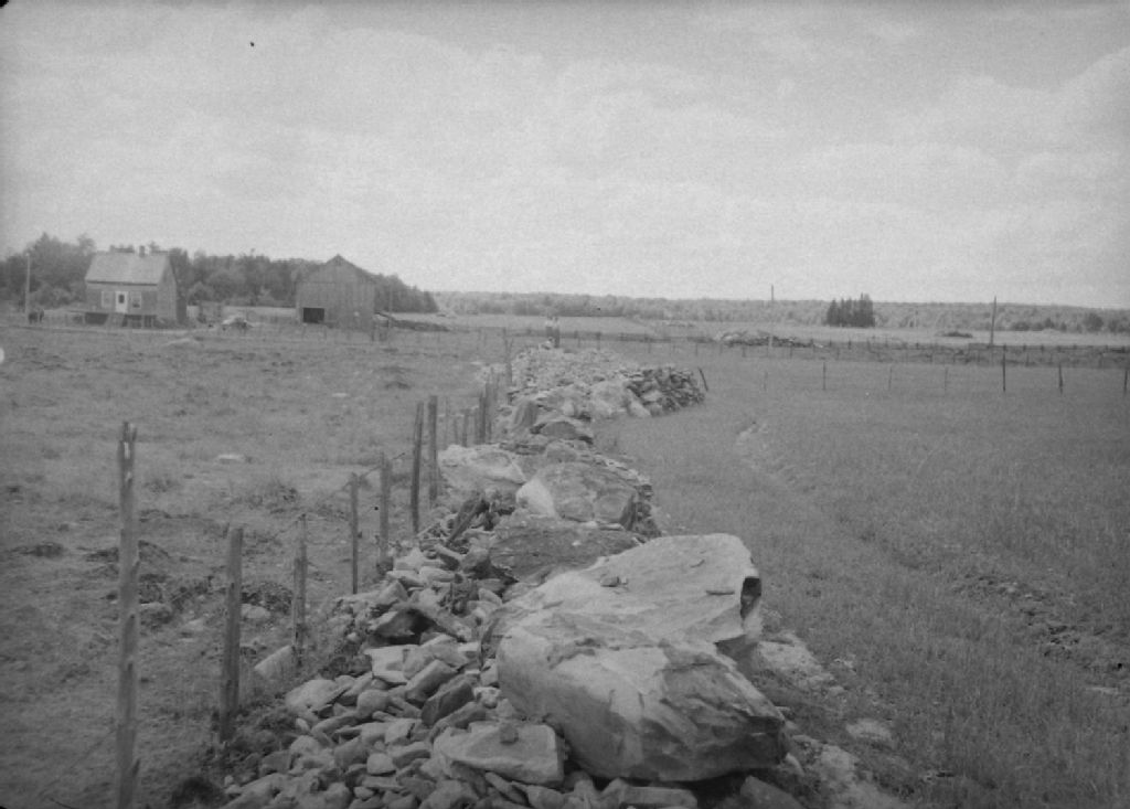 Épierrement au tracteur et terre neuve. À gauche, champ non épierré; à droite: champ de trèfle Ladino. Ce champ a été fait en terre neuve à l'automne 1948 et la digue au centre donne une idée de la pierre qui y a été enlevée. Chez Lucien Poulin à Saint-Honoré de Shenley, comté de Frontenac