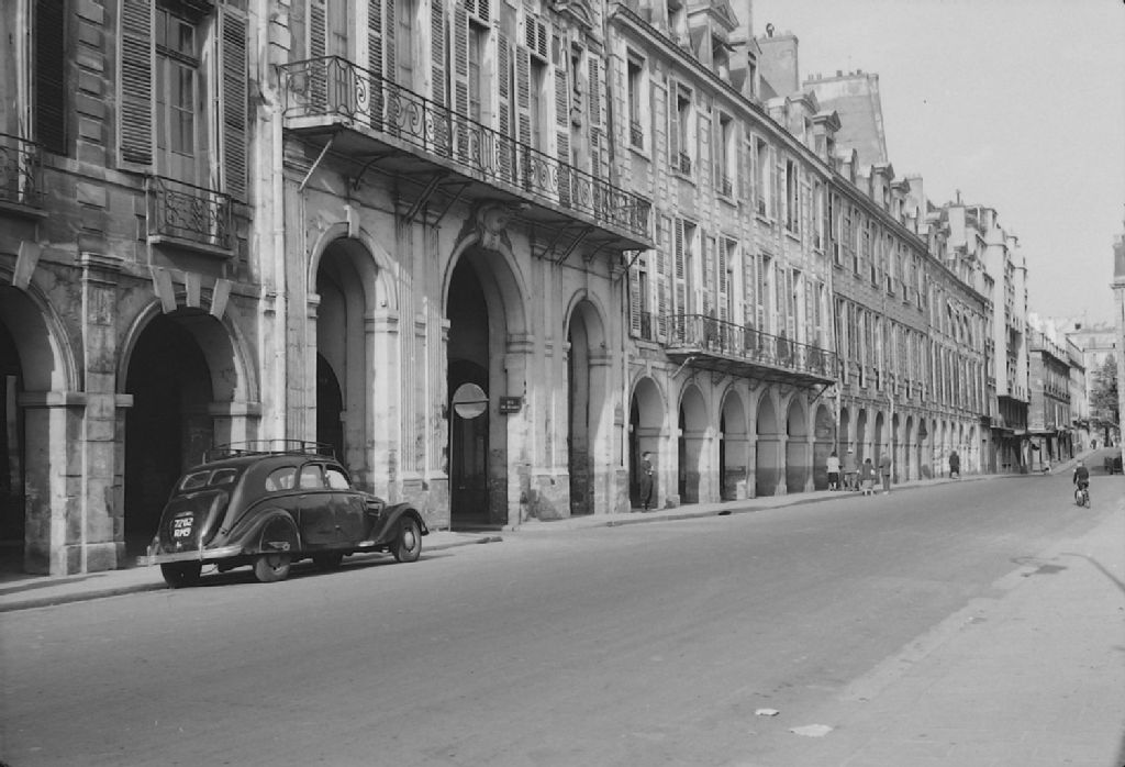 Place des Vosges. Rue à arcades sous les façades du XVIIe siècle, Paris. France, 1949, Archives nationales à Québec, Fonds Ministère de la Culture et des Communications, (03Q,E6,S7,SS1,D2,P70863), Benoit Brouillette.