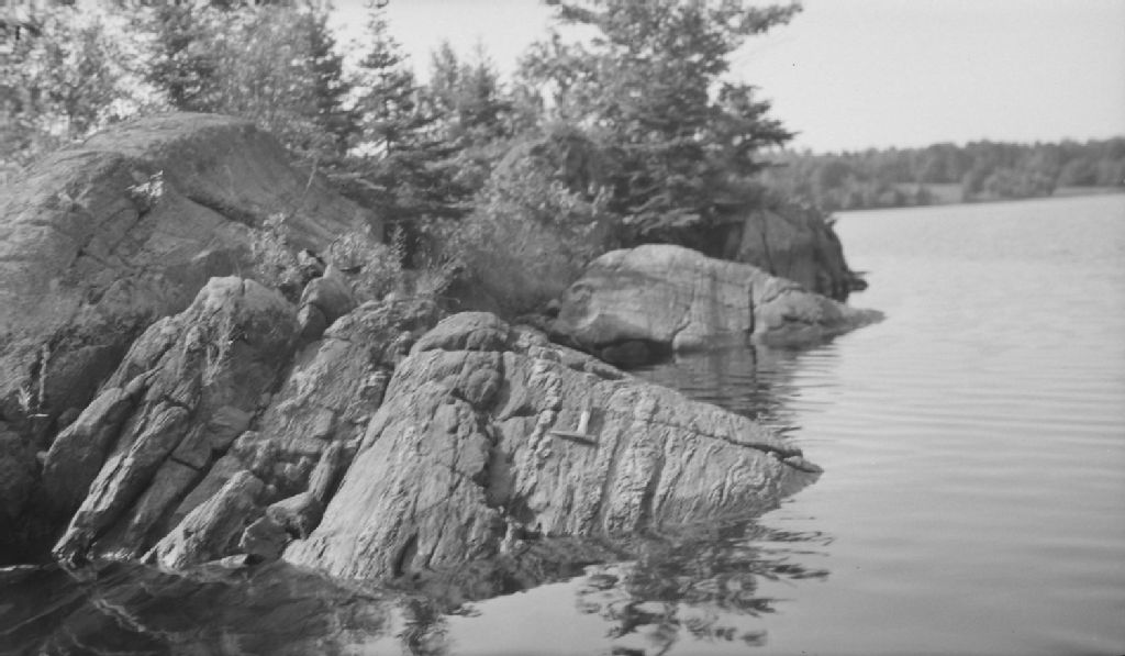 Paragneiss contenant des veinules de pegmatites suivant la schistosité en amont du barrage, chutes Paugan, Low, comté Gatineau
