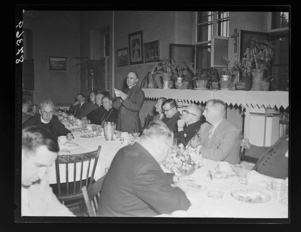 Son excellence Mgr Norbert Robichaud, archevêque de Moncton, adressant la parole aux pélerins de la Survivance et aux congressistes du IV congrès de l'ACELF, cathédrale de Moncton, Nouveau-Brunswick