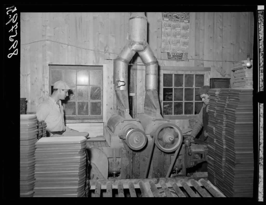 Sablage des planches à pain, Industries Baribeau, Inc, Lévis, 1951, Archives nationales à Québec, Fonds Ministère de la Culture et des Communications, (03Q,E6,S7,SS1,D2,P89579), Neuville Bazin.