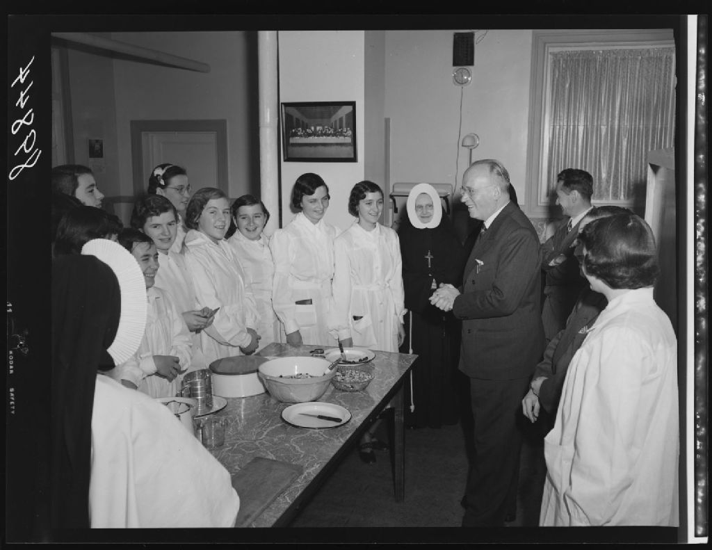 À la cuisine, un groupe d'élèves, deux religieuses, Messieurs Piva et Noël à l'école moyenne familiale de Gros Pin