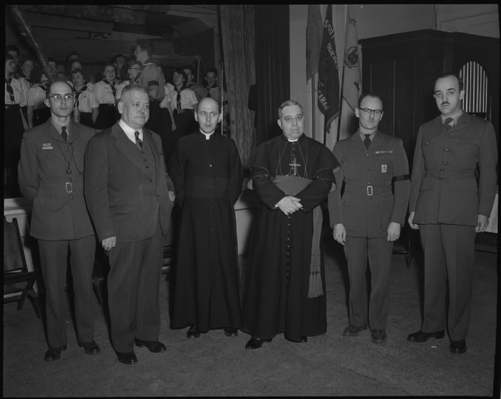 Groupe de personnalités à l'ouverture de la semaine scoute de gauche à droite: R.Hamel, C.R.U. Bédard, pro-maire abbé Simard, monseigneur Garant, Clément Gauthier, G.A. Bergeron à la Salle Saint-Jean-Baptiste