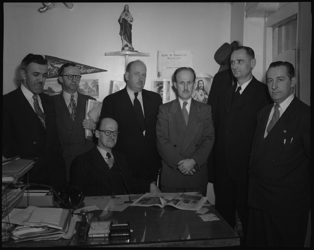 Quelques officiers de l'éxécutif de l'A.E.C. chez monsieur Bédard, propriétaire de l'Imprimerie Provinciale qui imprime la revue Contact, 1952, Archives nationales à Québec, Fonds Ministère de la Culture et des Communications, (03Q,E6,S7,SS1,D2,P90490), Neuville Bazin.