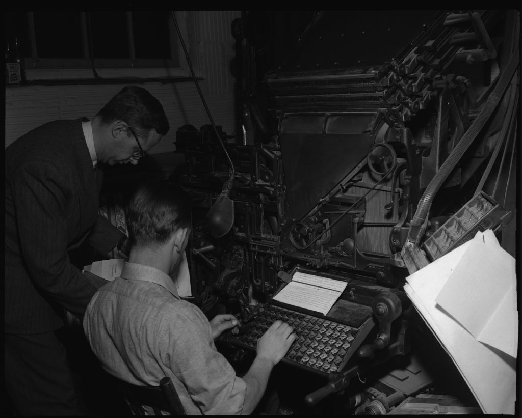Le linotypiste reçoit ici quelques instructions du directeur de la revue Contact, monsieur Martial Roy