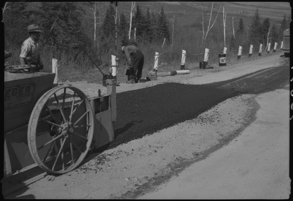 Rapiéçage du revêtement bitumineux, route numéro 2, Sainte-Rose-du-Dégelis, comté de Témiscouata, 1951, Archives nationales à Québec, Fonds Ministère de la Culture et des Communications, (03Q,E6,S7,SS1,D2,P90597), Jean Bastien.