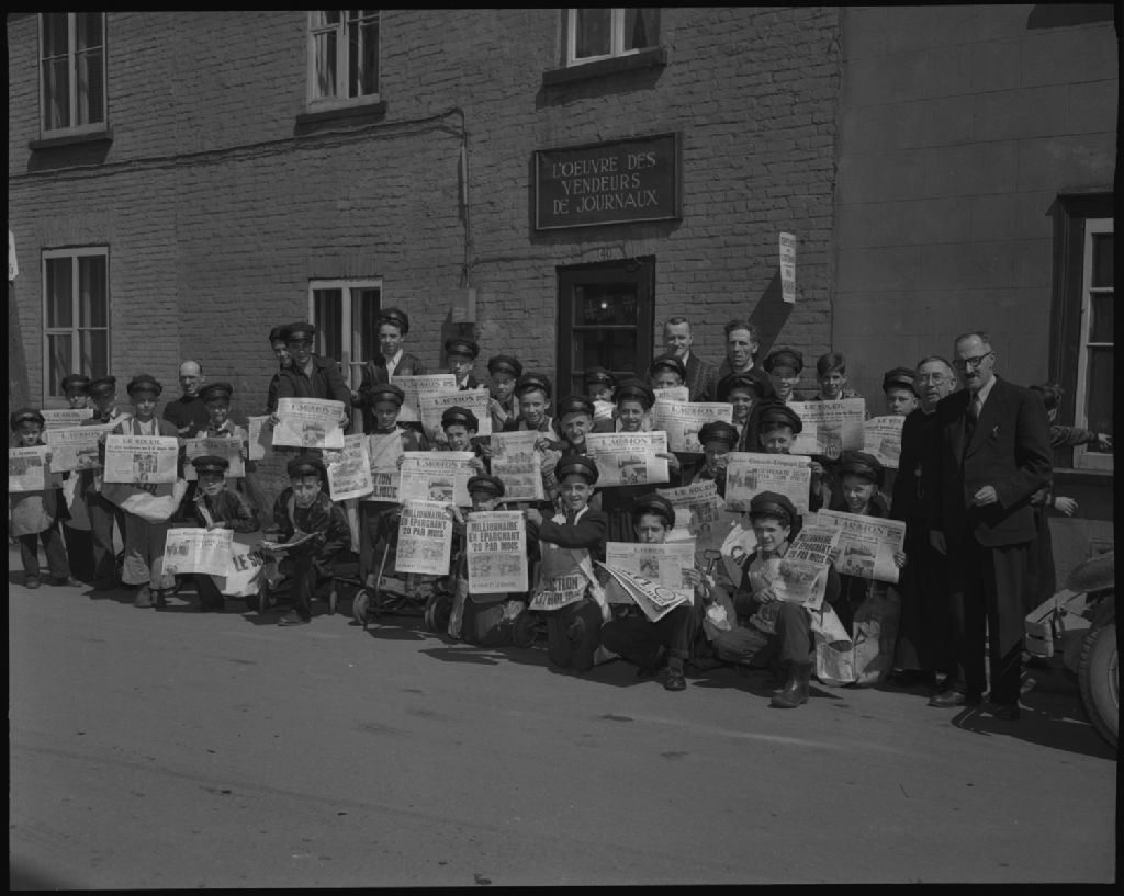 Les petits vendeurs de l'oeuvre des vendeurs de journaux. Révérend Frère Fortin, directeur et monsieur Henri Lacoursière, agronome publiciste, 1952, Archives nationales à Québec, Fonds Ministère de la Culture et des Communications, (03Q,E6,S7,SS1,D2,P90775), Neuville Bazin.