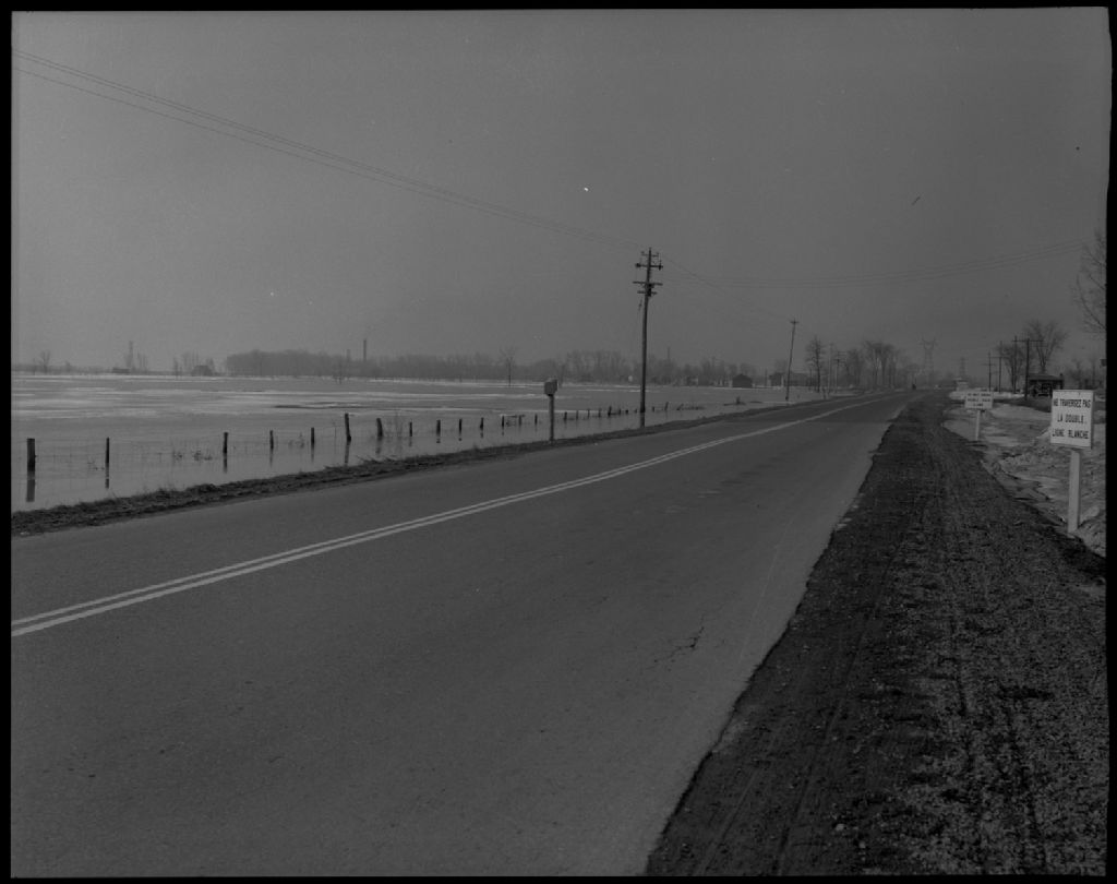 Inondation le long de la route nationale. Berthierville, 1952, Archives nationales à Québec, Fonds Ministère de la Culture et des Communications, (03Q,E6,S7,SS1,D2,P90809), J.W.Michaud.