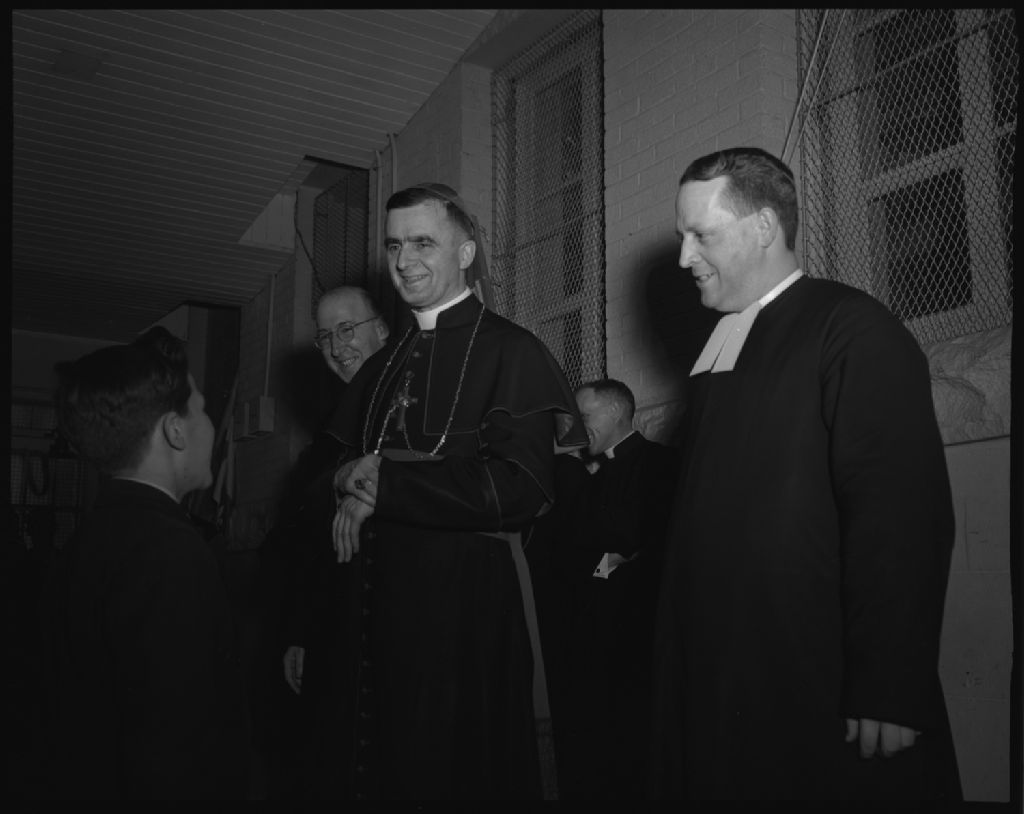 Son excellence monseigneur Maurice Roy s'entretenant avec un élève de l'Institut Saint-Jean Bosco