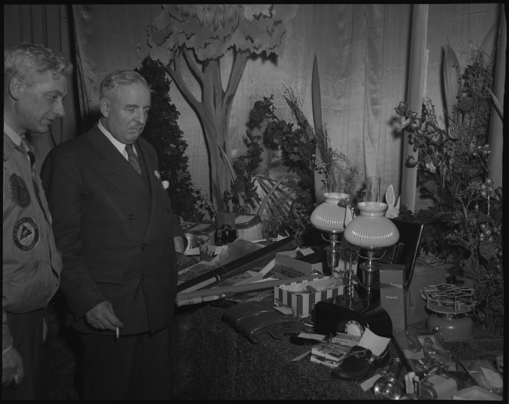 L'Honorable Pouliot et R. Martineau examinant un prix. Casting Club 38. Chemin Sainte-Foye, 1952, Archives nationales à Québec, Fonds Ministère de la Culture et des Communications, (03Q,E6,S7,SS1,D2,P90866), Neuville Bazin.