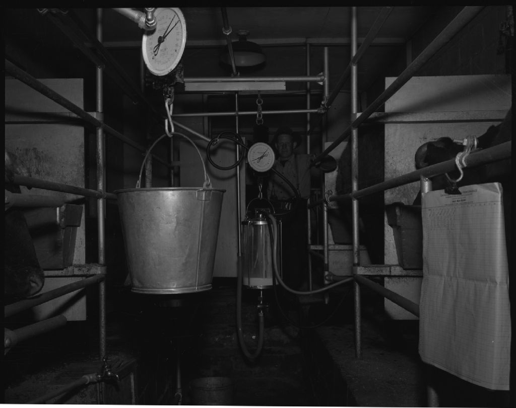 « Milking parlor » chez M. Abbott. Ferme Abbott, Varennes., 1952, Archives nationales à Québec, Fonds Ministère de la Culture et des Communications, (03Q,E6,S7,SS1,D2,P90927), Omer Beaudoin.