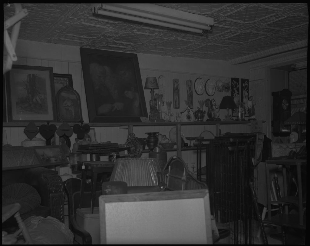 Intérieur d'un magasin tenu par un regrattier (une boutique seconde main) monsieur J.A. Ledoux qui vend de tout et s'occupe en collectionneur passionné des timbres, des lettres et des arts. Québec, 1952, Archives nationales à Québec, Fonds Ministère de la Culture et des Communications, (03Q,E6,S7,SS1,D2,P90944), Neuville Bazin.