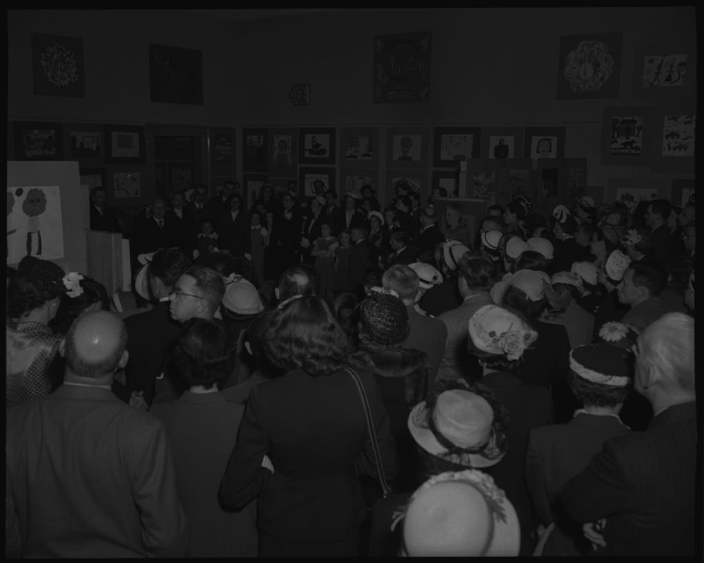 L'exposition des travaux de la classe des enfants de l'école des Beaux-Arts de Québec, Musée du Québec, 1952, Archives nationales à Québec, Fonds Ministère de la Culture et des Communications, (03Q,E6,S7,SS1,D2,P90975), Neuville Bazin.
