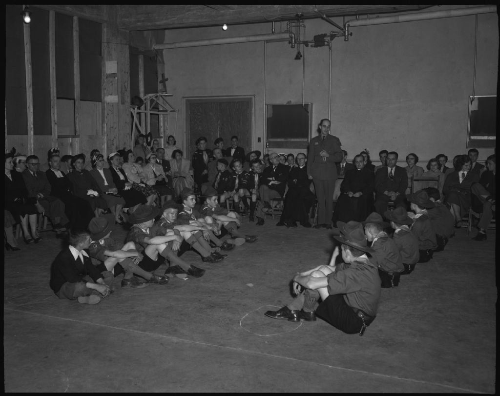Allocution du commissaire Robert Hamel. Troupe Scoute Saint-Charles-Garnier, 1952, Archives nationales à Québec, Fonds Ministère de la Culture et des Communications, (03Q,E6,S7,SS1,D2,P91013), Neuville Bazin.