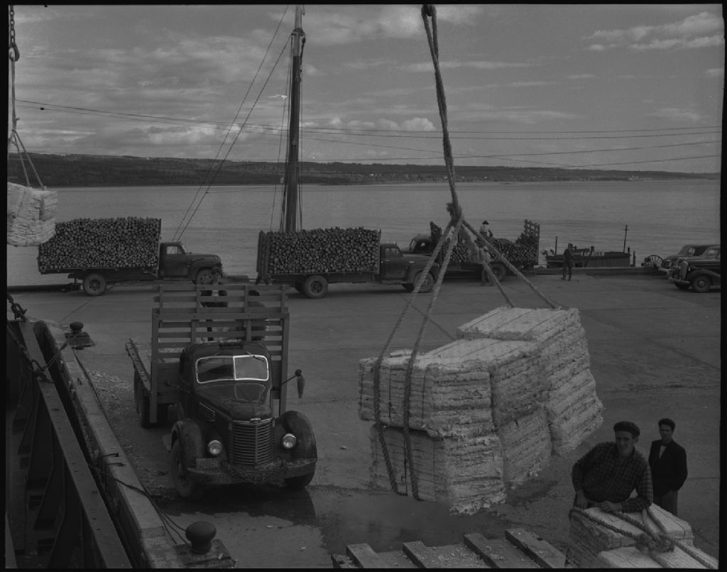 Quai de la rivière du Loup, chargement sur un bateau de bois à pulpe et pâte de bois, Rivière du Loup, comté Rivière du Loup, 1952, Archives nationales à Québec, Fonds Ministère de la Culture et des Communications, (03Q,E6,S7,SS1,D2,P91295), J.W.Michaud.