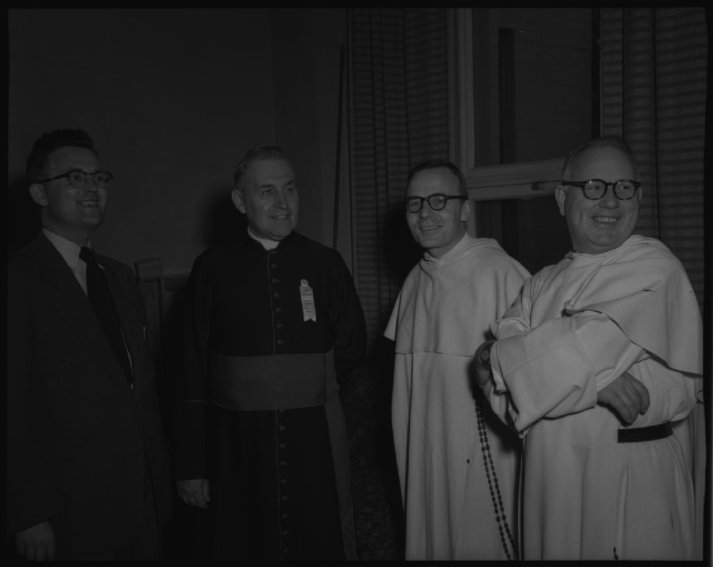Monsieur Napoléon Leblanc, monseigneur Ferdinand Vandry, révérend Père Bélanger, révérand Père Lévesque à la réunion des dirigeants de l'Éducation pour adultes. Pavillon Monseigneur Vachon