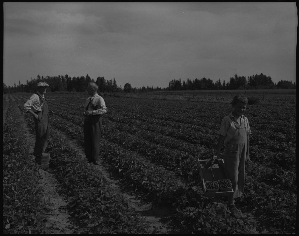 Champ de fraises chez Joseph Giguère à Sainte-Famille, Île d'Orléans, 1952, Archives nationales à Québec, Fonds Ministère de la Culture et des Communications, (03Q,E6,S7,SS1,D2,P91906), Neuville Bazin.