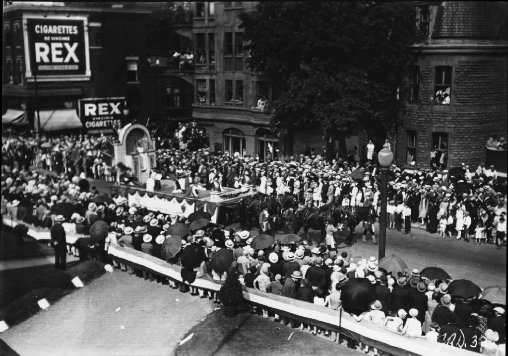 Montréal. Île de Montréal - Défilé 1928 de la Société Saint-Jean-Baptiste, [1928?], Archives nationales à Québec, Fonds ministère de la Culture et des Communications, (03Q,E6,S8,SS6,P238), Photographe non identifié.