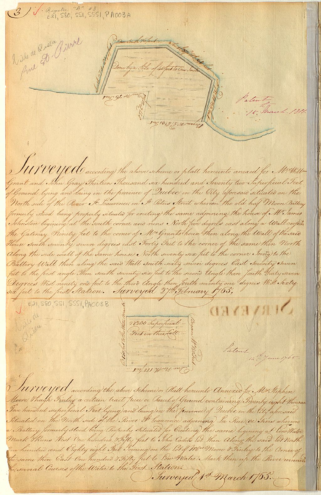 Sur ce plan d'un lot de Saint-Pierre, ville de Québec, figurent la rue Saint-Pierre, la batterie Royale, les dimensions d'un lot et les noms William Grant et John Gray