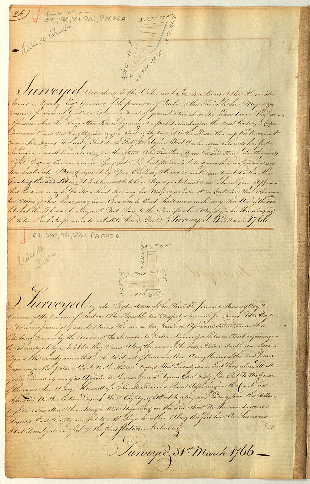 Sur ce plan d'un lot de Saint-Pierre, ville de Québec, figurent la Côte du Palais, les dimensions d'un lot et le nom James Potts