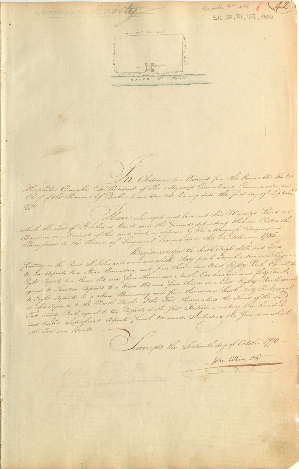 Plan des terres réservées au Roi, une partie de la ville Saint-Jean-sur-Richelieu autour du fort Saint-Jean