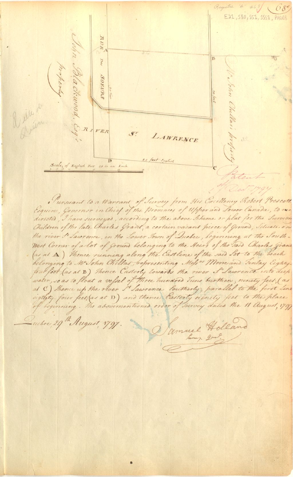 Sur ce plan de Saint-Pierre, ville de Québec, figurent la rue des Soeurs, le fleuve Saint-Laurent, les lots de grève, les lots en eaux profondes, la dimension des lots et le nom Charles Grant