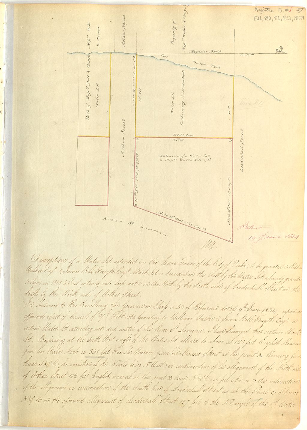 Sur ce plan d'un lot de grève de Saint-Pierre, ville de Québec, figurent la rue Arthur, la rue Saint-André, le fleuve Saint-Laurent, le lot de grève, la dimension du lot, les limites de la marée basse et les noms Bell et Munro, Walker et Forsyth