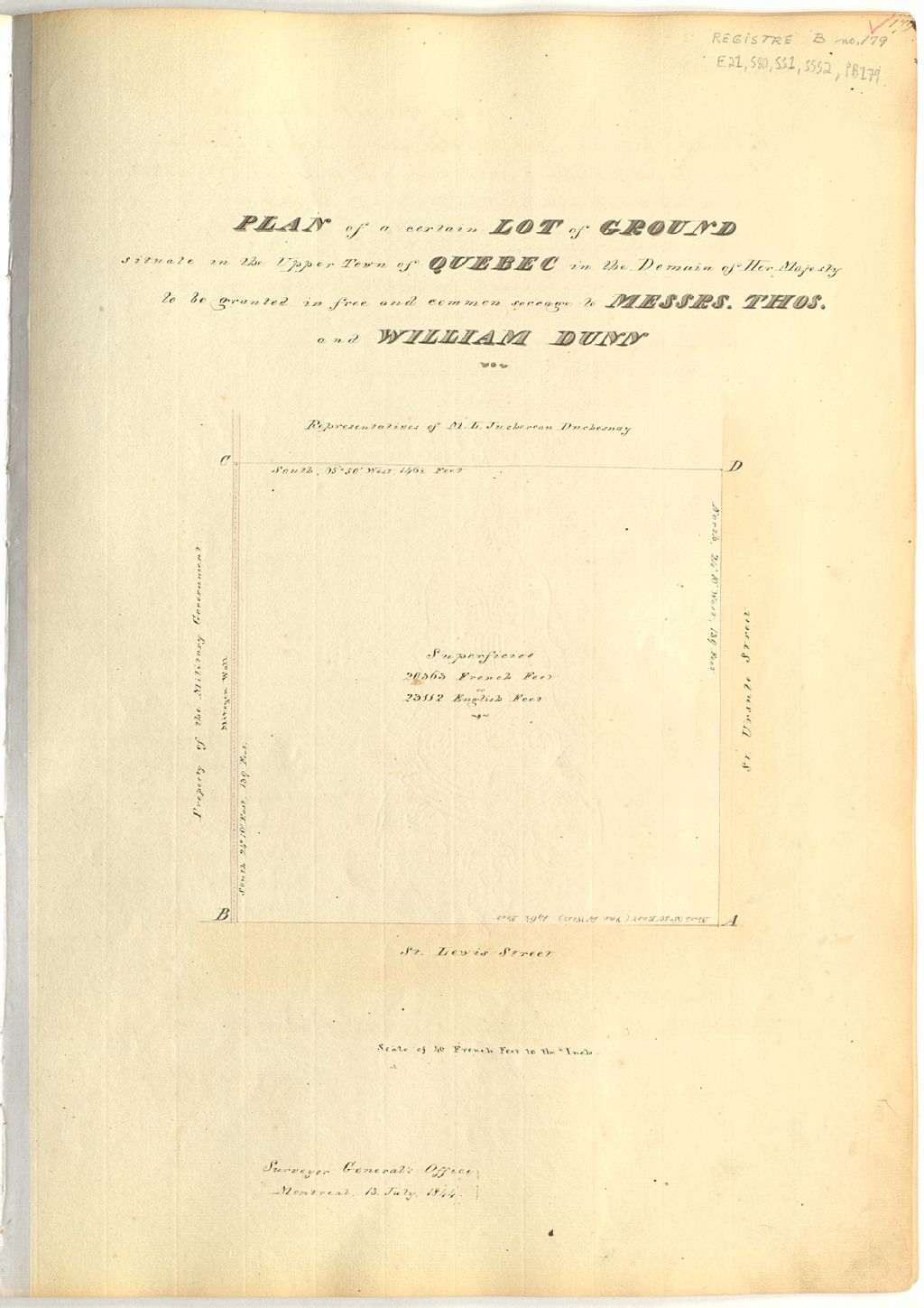 Plan of a certain lot of ground situate in the Upper Town of Quebec in the Domain of her Majesty to be granted in free and common soccage to messieurs Thomas and William Dunn.