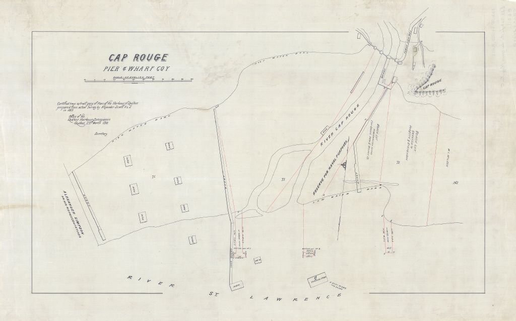 Sur ce plan d'une partie du village de Cap-Rouge figurent une partie de la rivière Cap-Rouge, une partie du fleuve Saint-Laurent, les quais, les piliers, les limites de la marée haute et de la marée basse, les lots de grève, les lots en eaux profondes, le barrage, les chemins, les bâtiments et la réserve. On y retrouve également les noms Alexander Simpson, Cap Rouge Pier & Wharf Coy, Forsyth et Stevenson. Aucun procès-verbal n'accompagne ce plan