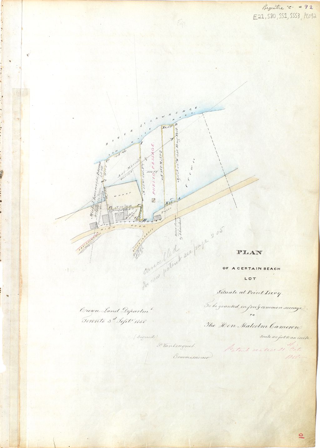 Plan of a certain beach lot situate at Point Levy to be granted in free and common soccage to the Hon. Malcolm Cameron