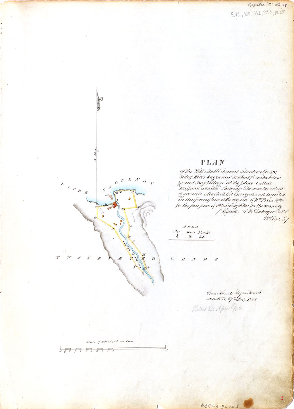 Plan of the mill establishment situate on the south west side of River Saguenay at about 7 1/2 miles below Grand Bay village at the place called Ruiseau à Caille shewing likewise the extent of ground attached to it surveyed and limited in due form of at the request to William Price & Co.