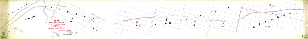 Plan of the Quebec & Lake St-John railway showing lands appropriated across crown lots in the township of Caron, Signai, Labarre & Kenogami.