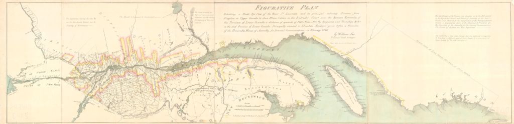 Figurative plan. Exhibiting a Bird's eye view of the river St-Lawrence and its principal tributary streams from Kingston in upper Canada to Ance Blanc Sablon on the Labrador coast now the eastern extremity of the province of Lower Canada.