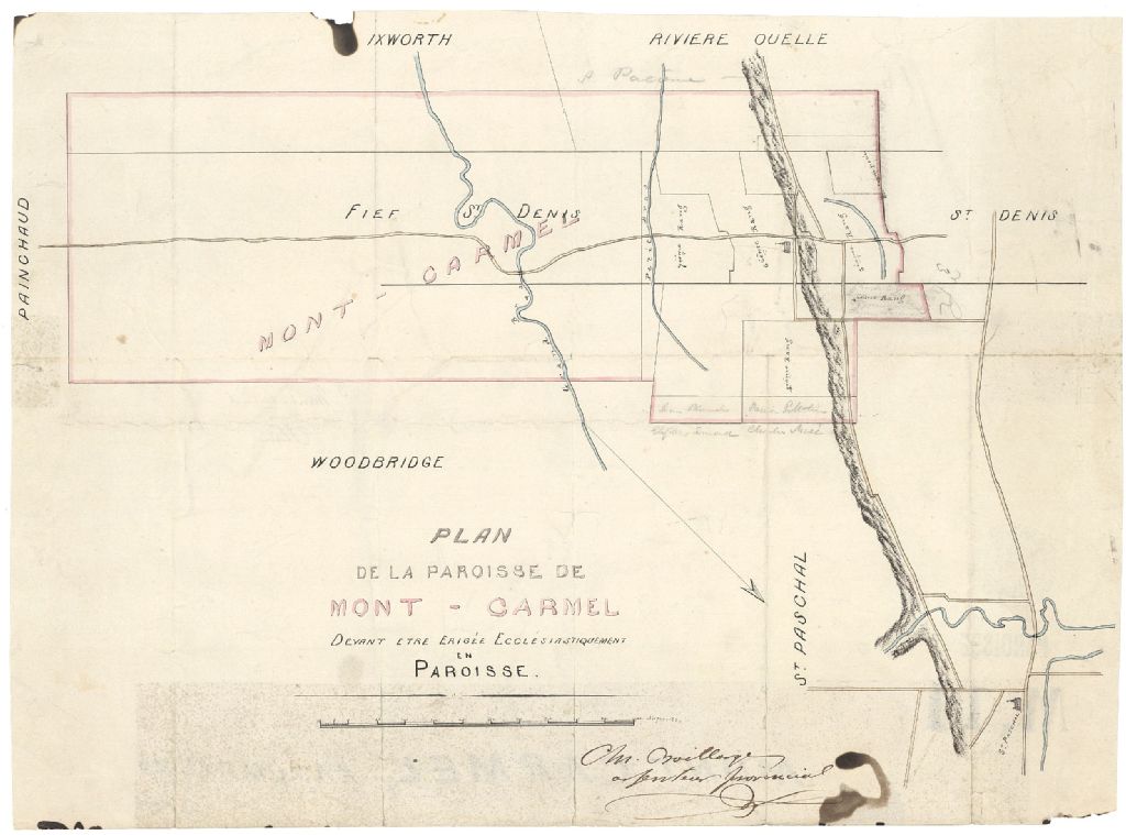Sur ce plan de la paroisse Notre-Dame-du-Mont-Carmel située dans la seigneurie La Bouteillerie figurent le relief, les limites de la paroisse, les chemins, les églises, les rivières ainsi que le nom des concessions