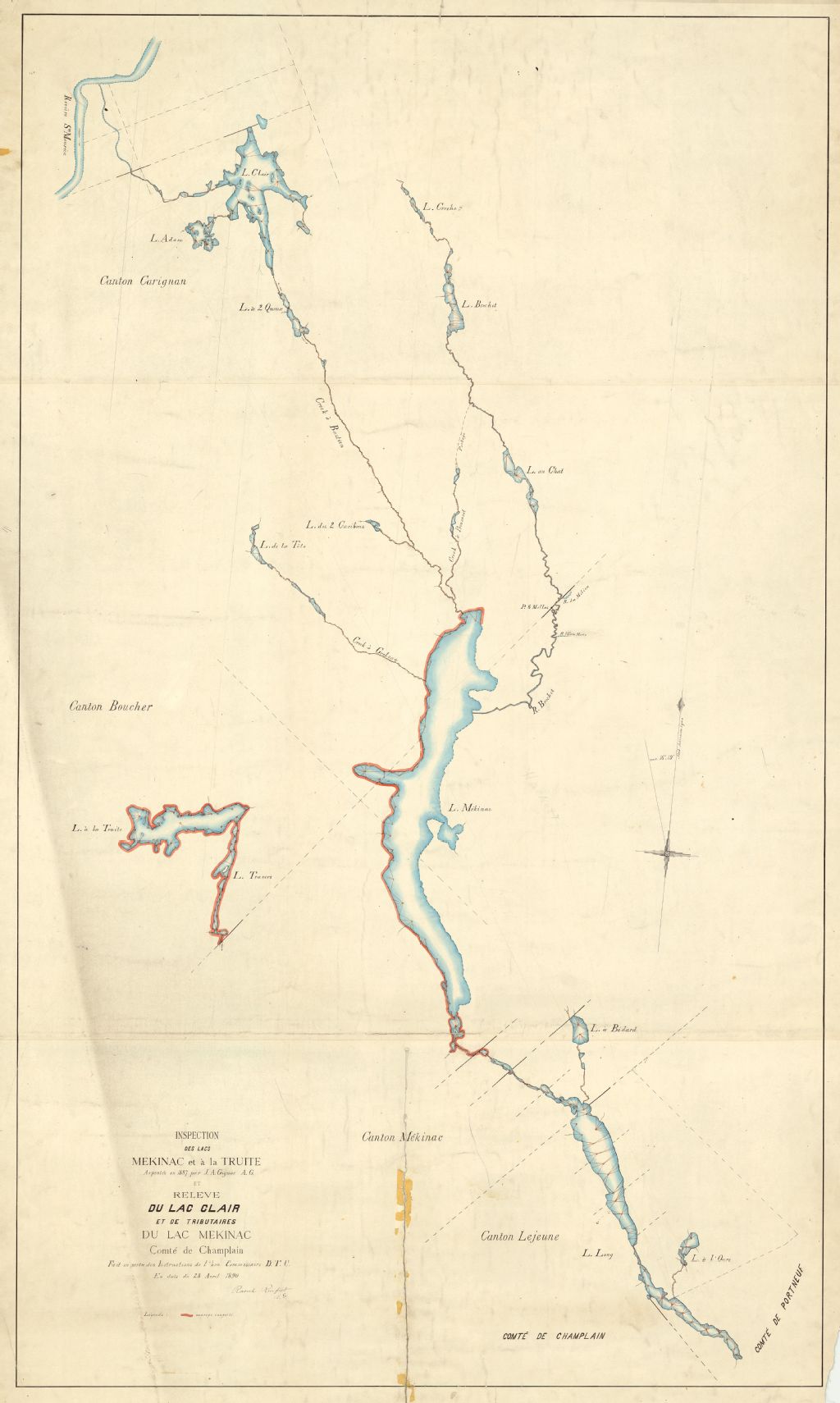 Inspection des lacs Mékinac et à la Truite, et relevé du lac Clair et de tributaires du lac Mékinac. Comté de Champlain.