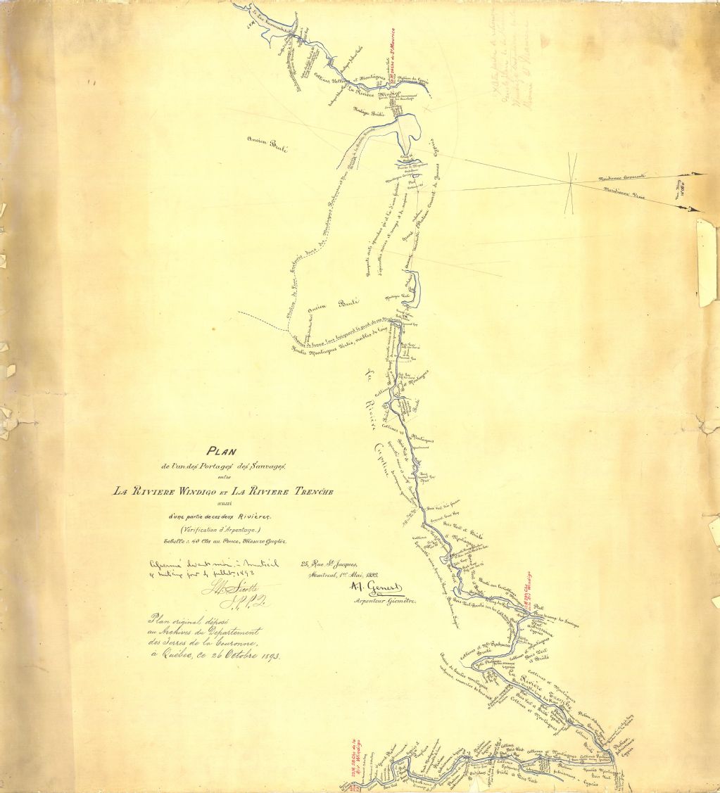 Plan de l''un des portages des sauvages entre la rivière Windigo et la rivière Trenche aussi d''une partie de ces deux rivières (vérification d''arpentage).