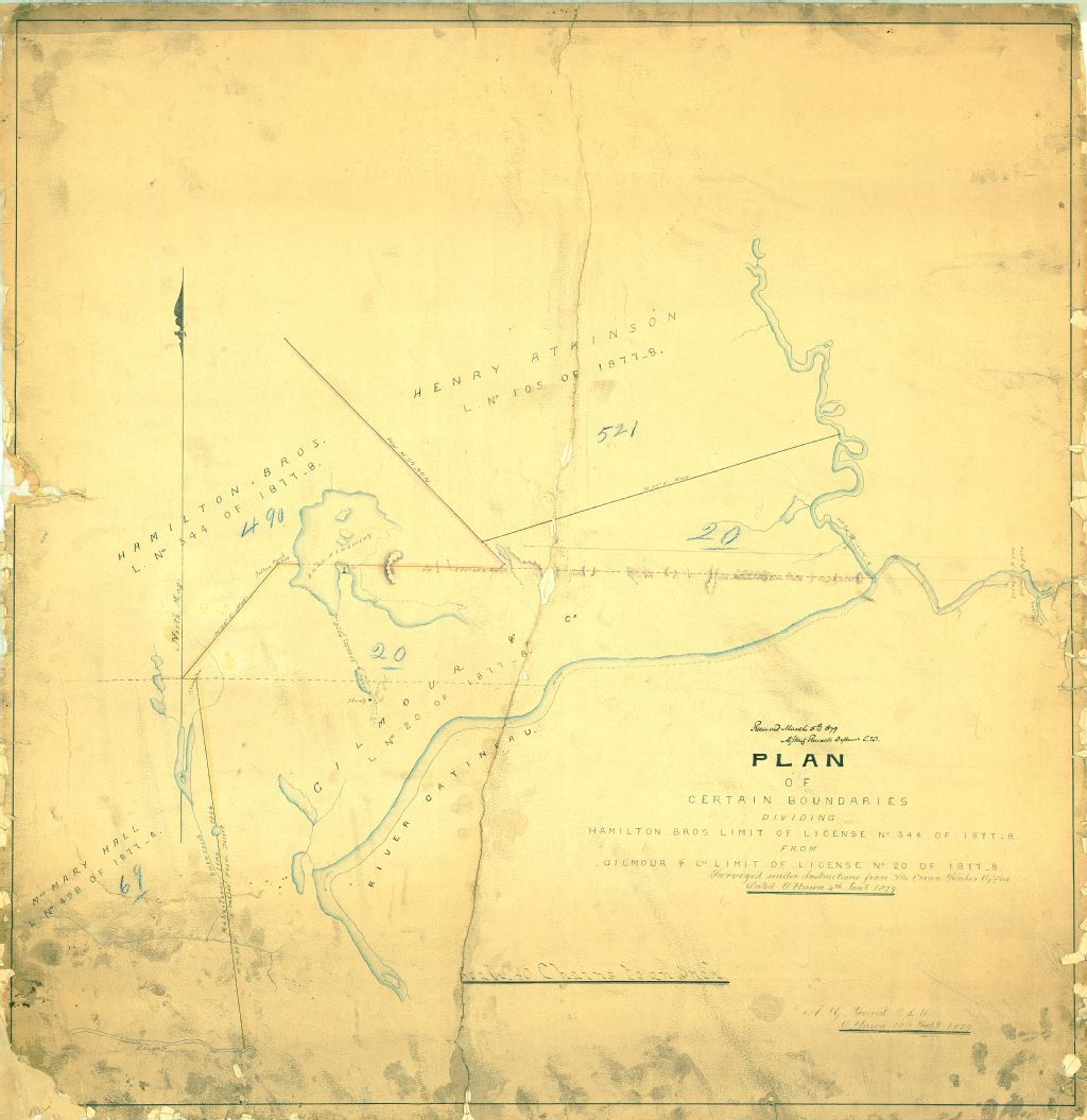 Plan of certain boundaries dividing Hamilton Bros. limit of license no 344 of 1877-8 from Gilmour & Co. limit of license no 20 of 1877-8.