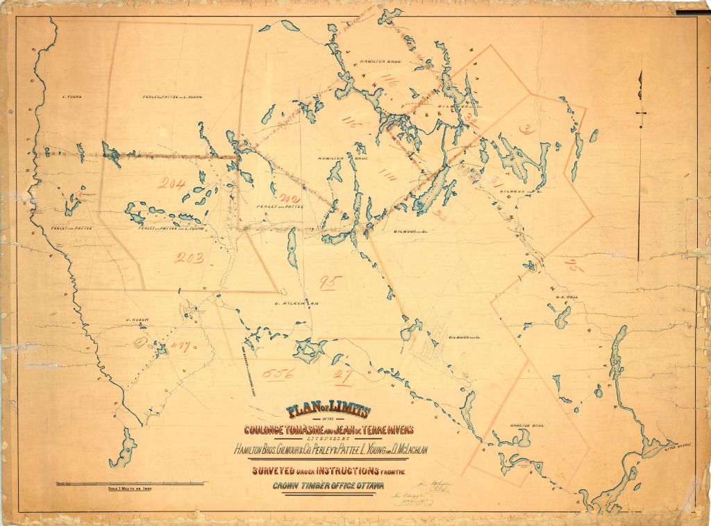 Plan of limits on the Coulonge Tomasine and Jean de Terre rivers licensed by Hamilton Bros. Gilmour & Co. Perley & Pattee L. Young and D. McLachlan.