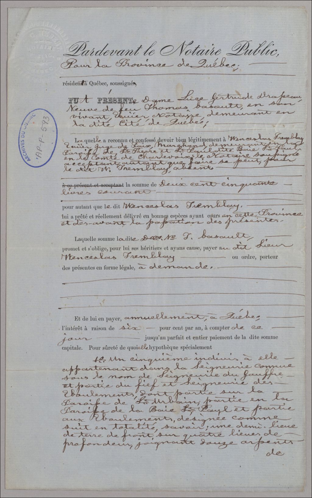 Obligation par Dame Luce-Gertrude Drapeau (Casault) en faveur de Winceslas Tremblay, fait et passé à Québec, Étude de Mtre [sic] Jean-Baptiste-Célestin Hébert