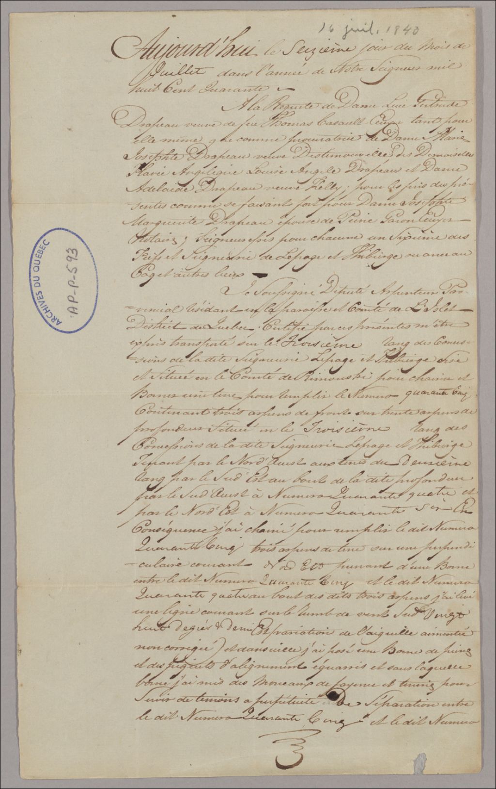 Procès-verbal de Chainage et Bornage d'une terre dans le troisième rang de la Seigneurie de Lepage et Thivierge, signé par Duncan Stephen Ballantyne, arpenteur provincial du District de Québec, 16 juillet 1840, Archives nationales à Rimouski, Fonds Luce-Gertrude Drapeau-Casault, (01R,P31,P38).