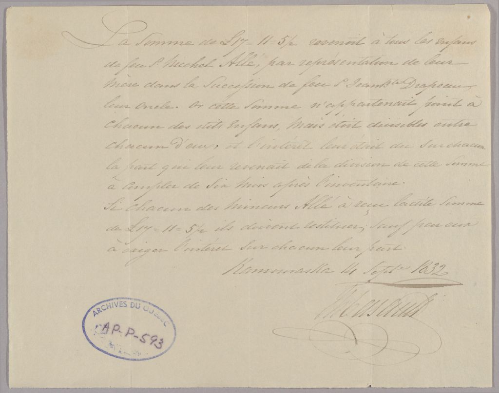 - Le document fait état d¿une somme d¿argent revenant à tous les enfants de feu Michel Halllé dans la succession de Jean-Baptiste Casault, leur oncle et mentionnant qu¿ils doivent restituer la dite somme