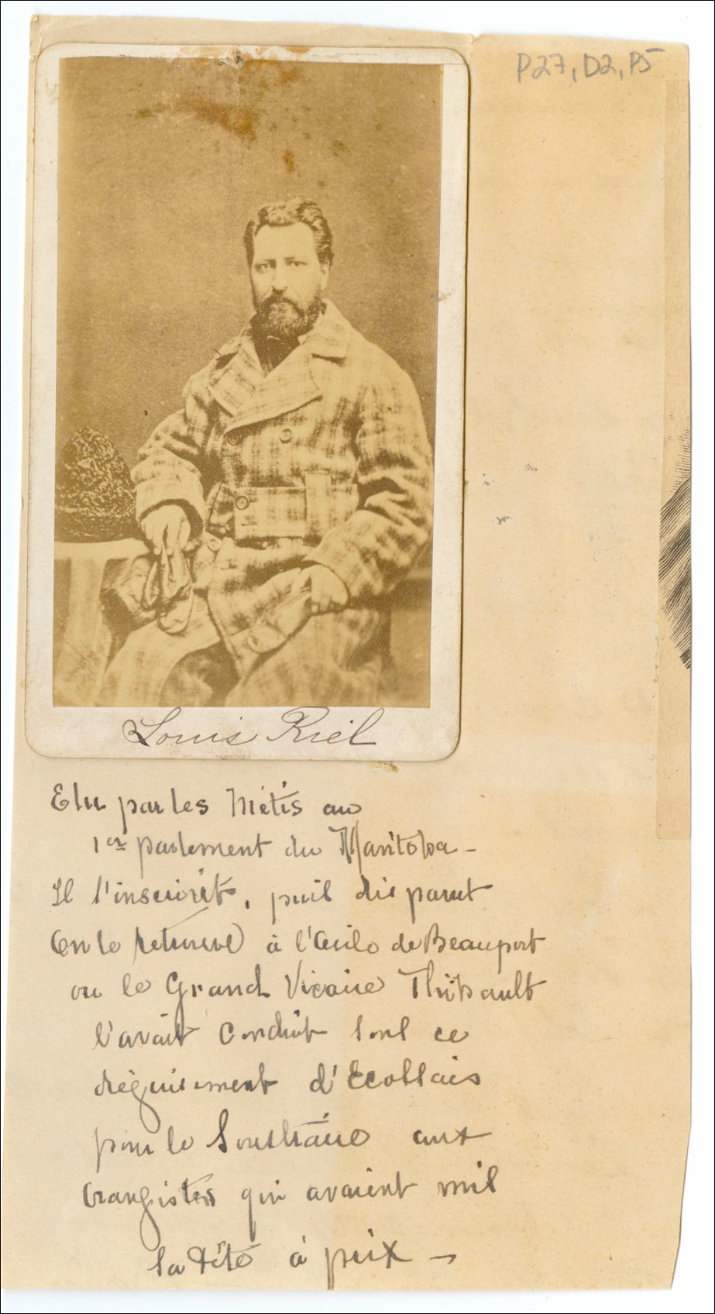 Louis Riel. Élu par les Métis au 1er parlement du Manitoba. Il l'inscrivit, puis diparut . On le retrouve à l'aile de Beauport où le Grand Vicaire Thibault l'avait conduit sous ce déguisement d'écoliers pour le soustraire aux orangistes qui avaient mis sa tête à prix.