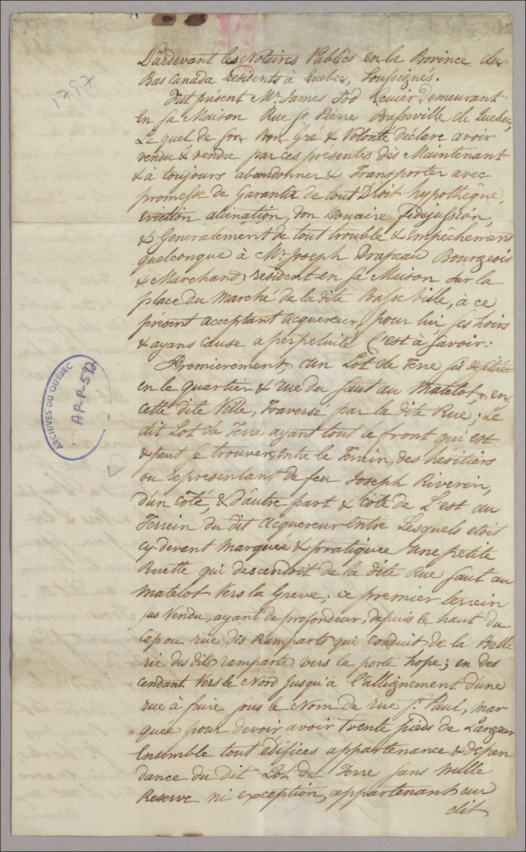 Vente de divers Lots de terre par James Tod à Joseph Drapeau, fait et passé à Québec, devant Mtres [sic] Alexandre Dumas et Charles Voyer, Étude de feu Mtre [sic] Dumas