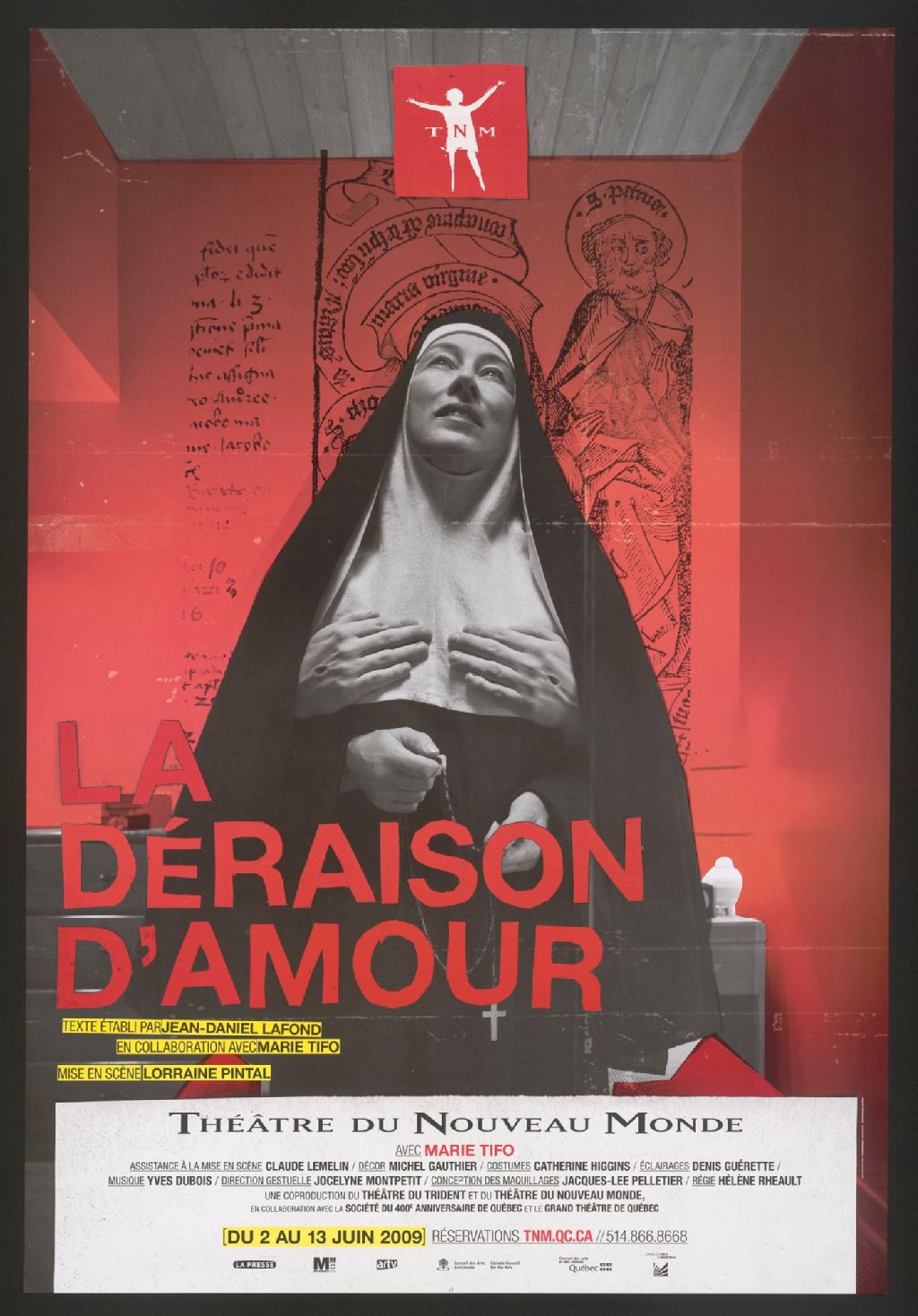 La déraison d'amour, texte établi par Jean-Daniel Lafond en collaboration avec Marie Tifo, mise en scène Lorraine Pintal ... avec Marie Tifo ... une coproduction du Théâtre du Trident et du Théâtre du Nouveau Monde en collaboration avec la Société du 400e anniversaire de Québec et le Grand Théâtre de Québec ...
