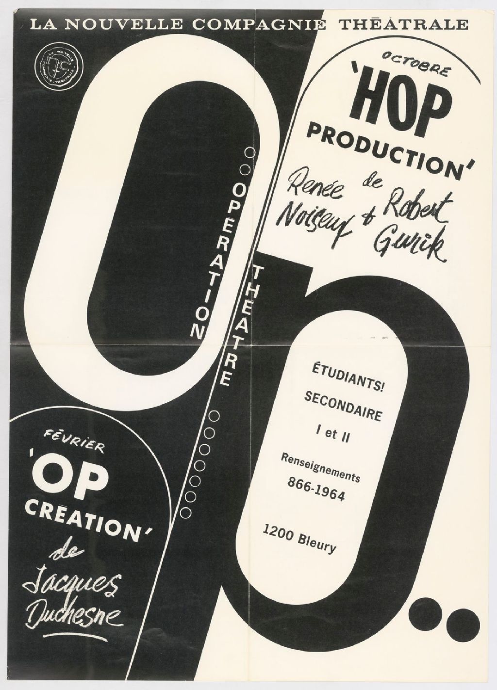 La Nouvelle Compagnie théâtrale, Opération théâtre, Hop production, de Renée Noiseux et Robert Gurik, Op création, de Jacques Duchesne étudiant secondaire I et II ...